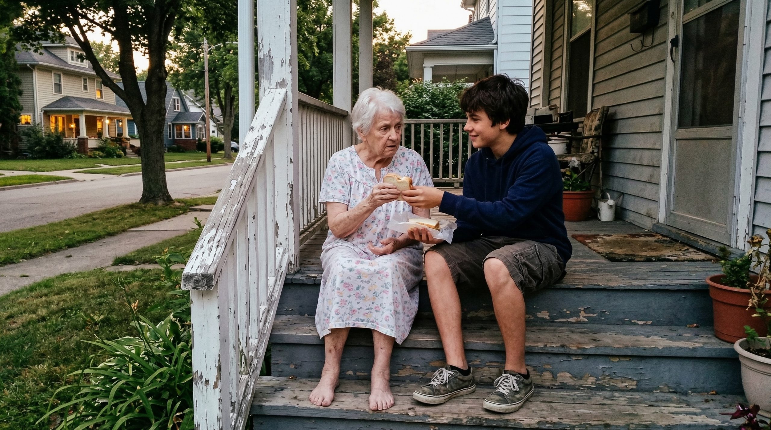 Võtsin ta käest kinni ja viisin sinna, kuhu ta tahtis — vana maja trepile, mis kuulus juba ammu teistele. Istud rahulikult, jagasin oma võileiba, ja tema rääkis pojast, kes ehitas hoovis onne. Kui ta tukkuma jäi, helistasin asutusse, kus ta elas, ja lahkusin enne nende saabumist.