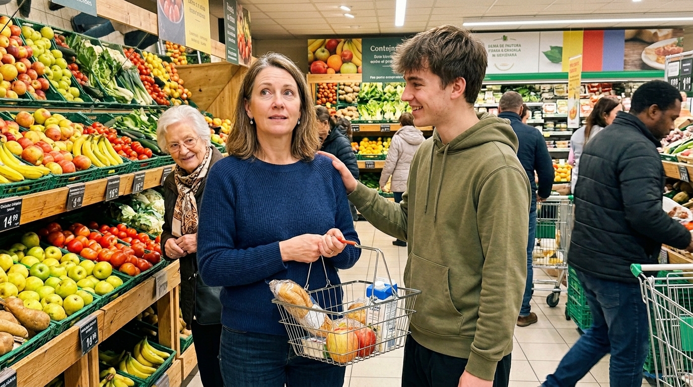 Siis ilmus välja see naine. Umbes neljakümne viiene, hoolitsetud, kallis — selles mõttes, et kõik tema juures oli kallis: riided, kott, kontsad. Käru ääreni täis — šampanja, delikatessid, kõik pakitud. Ta ei vaadanud järjekorda. Lihtsalt surus oma käru ema toolist ette — piisavalt järsult, et esiratas viltu tõmbus.